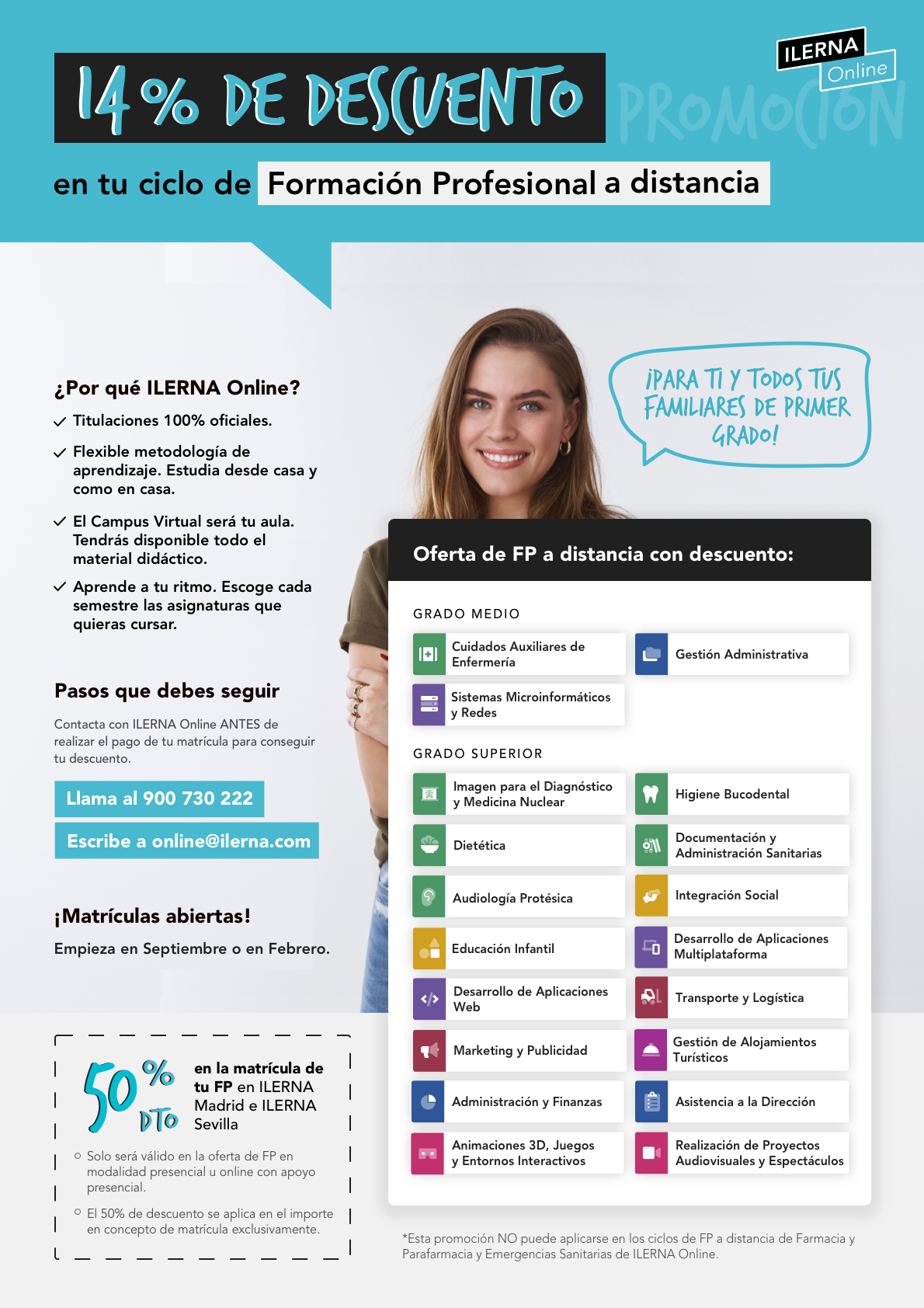 Contacta con el teléfono o email que figura en la imagen, aporta el certificado de afiliación que puedes descargarte de nuestra web, y tendrás un descuento del 14% en la matrícula de los ciclos de FP a distancia que les interese cursar con ILERNA Online