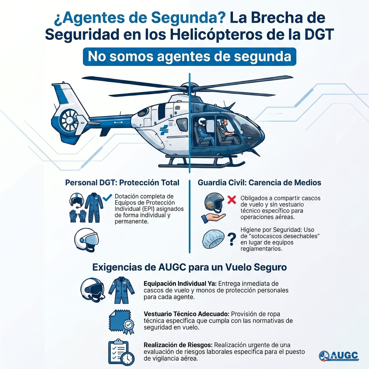 Por todo ello, AUGC exige la adopción urgente de medidas que aseguren la dotación individual de cascos de vuelo, la provisión de vestuario técnico adecuado, la entrega de monos de vuelo a todo el personal y la realización de una evaluación específica de riesgos del puesto.