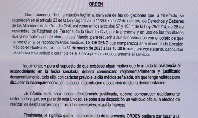 Por ello, AUGC Huelva ha denunciado estas formas, tanto a la Oficina del Defensor del Pueblo, como al General de la Zona, por lo que considera “una citación contraria a la normativa interna, amenazante” que menoscaba los derechos de los guardias civiles que se encuentran de baja por enfermedad, que ante el desconocimiento y las amenazas de sanciones disciplinarias, se sentirán confundidos y sobre todo, que este tipo de citaciones desfavorece la recuperación de determinadas enfermedades.