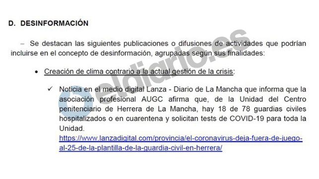 En el informe que elabora diariamente la Unidad de Coordinación de Ciberseguridad de la Guardia Civil se clasifica como "desinformación" una nota de prensa emitida recientemente por AUGC en la que informaba de que 18 de los 78 guardias civiles destinados en la cárcel Herrera de la Mancha estaban ingresados o en cuarentena. Ante ello, desde nuestra organización debemos mostrar nuestro estupor y más enérgica desaprobación.