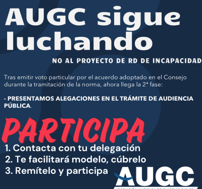 Desde que se nos presentó el proyecto de RD de incapacidad con recortes de derechos sin precedentes y donde, de aprobarse con la actual redacción pasaremos a ser los únicos funcionarios sin días de indisposición, AUGC ha tenido muy claro que la lucha será larga y complicada, pero que nunca cesaremos hasta conseguir eliminar lo que consideramos un agravio más, de los muchos que nos está haciendo este gobierno.