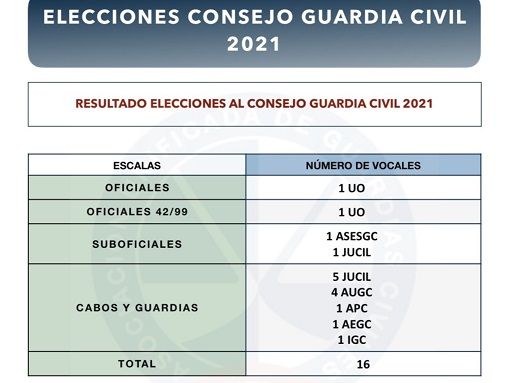 En esta escala, AUGC ha obtenido un total de 9.875 votos, lo que le ha valido un total de cuatro vocales.Ha que recordar también que en las elecciones de 2017 se eligieron 15 vocales, pero en estas elecciones se incrementó el número de vocales a 16, al aumentarse una plaza para la Escala de Cabos y Guardias (de 11 a 12).