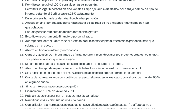 Durante este primer año de acuerdo (Octubre 2022- Octubre 2023), numerosos asociados han podido conseguir la vivienda de sus sueños gracias a las hipotecas que han conseguido con esta empresa de intermediación hipotecaria, otros muchos han podido cambiar sus hipotecas de tipo variable a tipo fijo; lo que les ha supuesto un ahorro considerable en su cuota mensual.