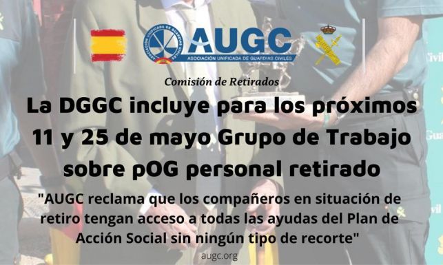 Estas son algunas de las cuestiones que contempla el proyecto normativo con rango de Orden General. La Asociación Unificada de Guardias Civiles también reclama que haya un aumento del presupuesto para que los compañeros en situación de retiro disfruten de la totalidad de las Ayudas del Plan de Acción Social y que se les elimine el vigente copago farmacéutico del 30 %. Calificamos de situación irregular que tengan que afrontarlo con independencia de su poder adquisitivo, ya que quiebra los principios constitucionales de equidad e igualdad.