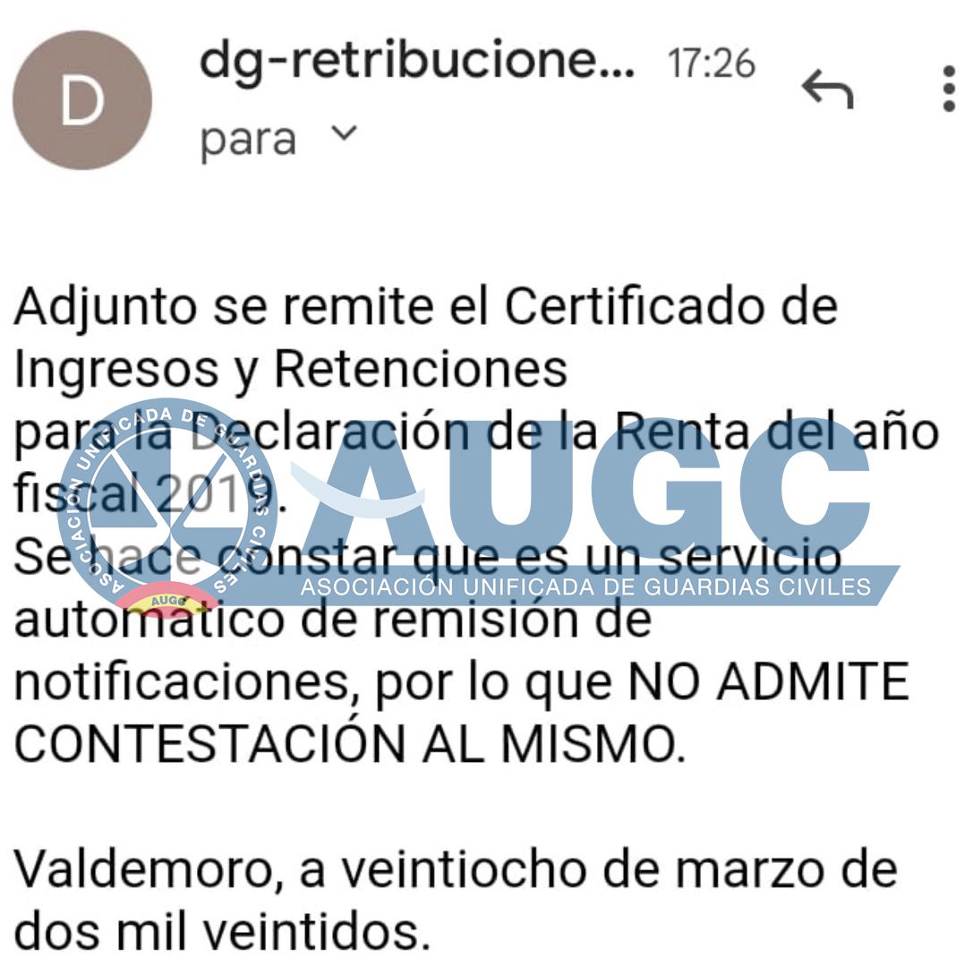 Las peculiaridades que acostumbra tener la Dirección General de la Guardia Civil son inadmisibles y chapuceras. Además de la doble vara de medir que muestra perjudicando a ciertos compañeros, de que nos lleva hacia un retroceso en nuestros derechos y libertades, de la falta de medios y personal y de un largo etcétera, tenemos que soportar la patente ineptitud con el recibo de correos para la Declaración de la Renta de 2019. Como profesionales y trabajadores nos avergüenza la situación y exigimos, como poco, la misma seriedad y atención que se le requeriría a cualquier otra persona a la hora de realizar su trabajo. Mañana, en el Pleno, el Consejo de la Guardia Civil tendrá que explicar a la Asociación Unificada de Guardias Civiles el motivo de semejante ineptitud.