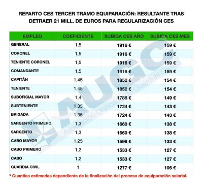 Pero el abuso no termina ahí, y del resto de la cantidad destinada al CES, nuevamente vuelven a aplicar unos coeficientes para remunerar por empleos, y no por escalas, lo que conlleva a un aumento notorio en la parte más alta del organigrama de la Guardia Civil, es decir, en los generales, quedando de la siguiente manera: