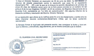Ante esa propuesta el General Jefe dicta Resolución de 4 de marzo de 2024 por la que acuerda dar por terminado el expediente e impone la sanción disciplinaria, rebajando la misma a pérdida de cinco días de haberes. Pero ante la inconformidad de dicha Resolución, el guardia civil a través de la Letrada de AUGC en Tenerife, Dña. Begoña González Fleitas, interpuso Recurso de Alzada ante Director General de la Guardia Civil, en el que se alegaba, entre otras o cosas, que la orden no fue debidamente transmitida, ya que la sargento la publicó en un grupo de WhatsApp (en el que sabía que no estaba el encartado), con la finalidad de que los guardias civiles compañeros transimitieran la orden al compañero, pero no lo hicieron según apinya la sargento. Así mismo, por la Letrada se hizo referencia no solo a las testificales a favor del encartado, sino a las contradicciones en las que había incurrido la sargento entre lo consignado en el parte disciplinario y sus dos declaraciones. Se alegaba por parte de la Letrada los requisitos que tiene que debe conllevar toda orden según jurisprudencia del Tribunal Supremo.