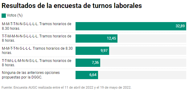 El turno más votado por las 10.061 personas que participaron ha sido el siguiente: M-M-T-T-N-N-S-L-L-L-L con un tramo horario de 8.30 horas.