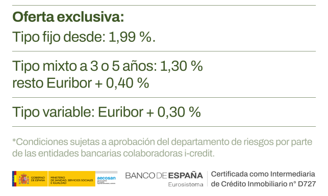 La exclusiva oferta tiene un tipo de interés al 1,99 % pudiendo conseguir incluso el 100 % de hipoteca más gastos gracias al acuerdo que tenemos en AUGC con I-Credit. Incluso para segunda residencia.