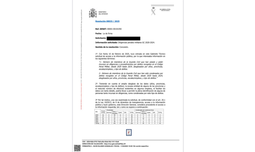 Según la información proporcionada por la Dirección General de la Guardia Civil, en el periodo comprendido entre 2020 y 2024 se han iniciado 167 procedimientos penales militares contra guardias civiles. De estos, 224 agentes han sido encartados en dichos procedimientos, y 41 han acabado condenados por sentencia firme. Sin embargo, el análisis de estos datos pone de manifiesto una realidad alarmante: mientras que el 25% de los encartados de la escala de Cabos y Guardias terminan condenados, en la escala de Suboficiales la tasa de condena baja al 10%, y en la de Oficiales se reduce a un irrisorio 4%.