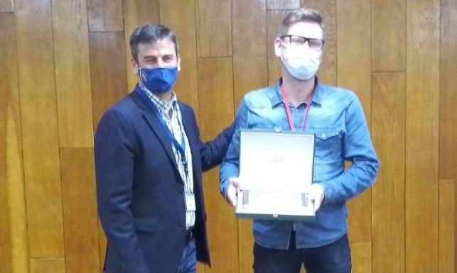 Gustavo Pérez, el nuevo Secretario General Provincial de la Delegación de Córdoba, recoge la placa de su antecesor.