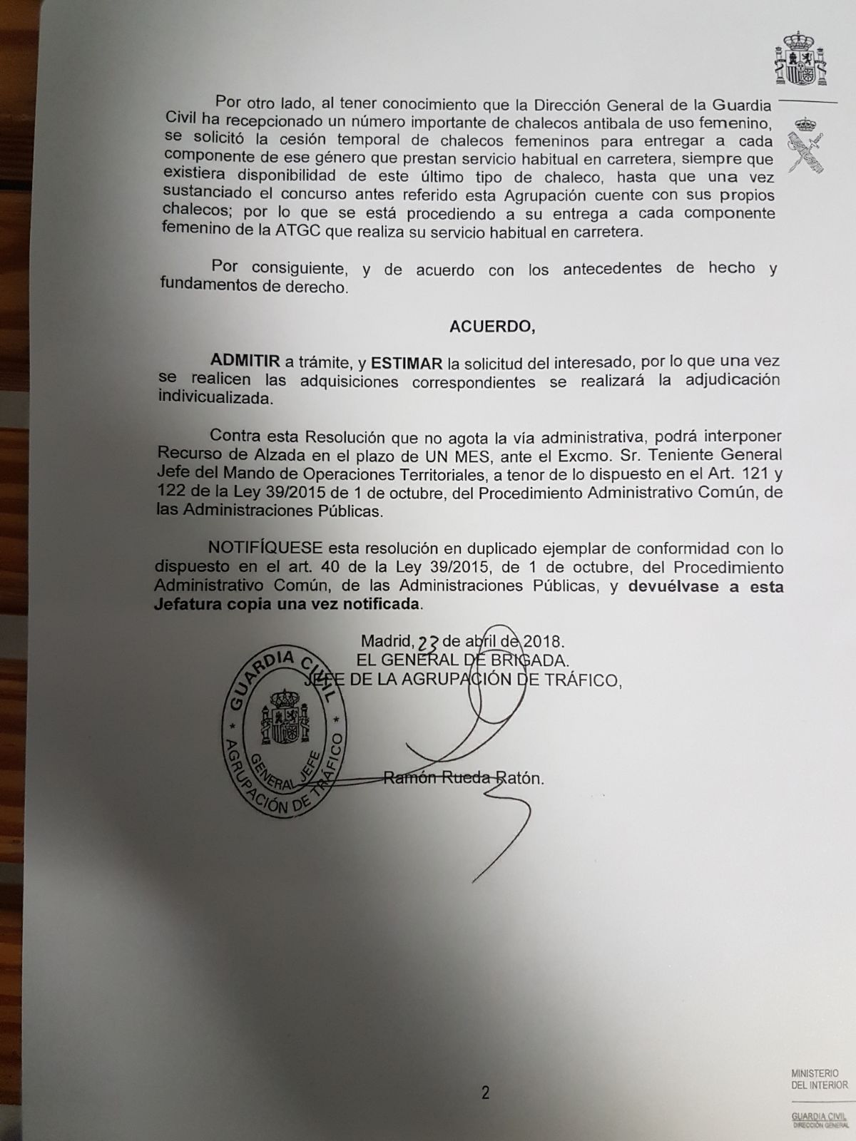 La Jefatura de la Agrupación de Tráfico de la Guardia Civil ha admitido a trámite y aprobado una instancia que les hizo llegar en su unidad de destino el pasado mes de febrero una representante de AUGC, en la que solicitaba que se la dotase de un chaleco antibalas individual femenino, y atendiendo a su talla real.