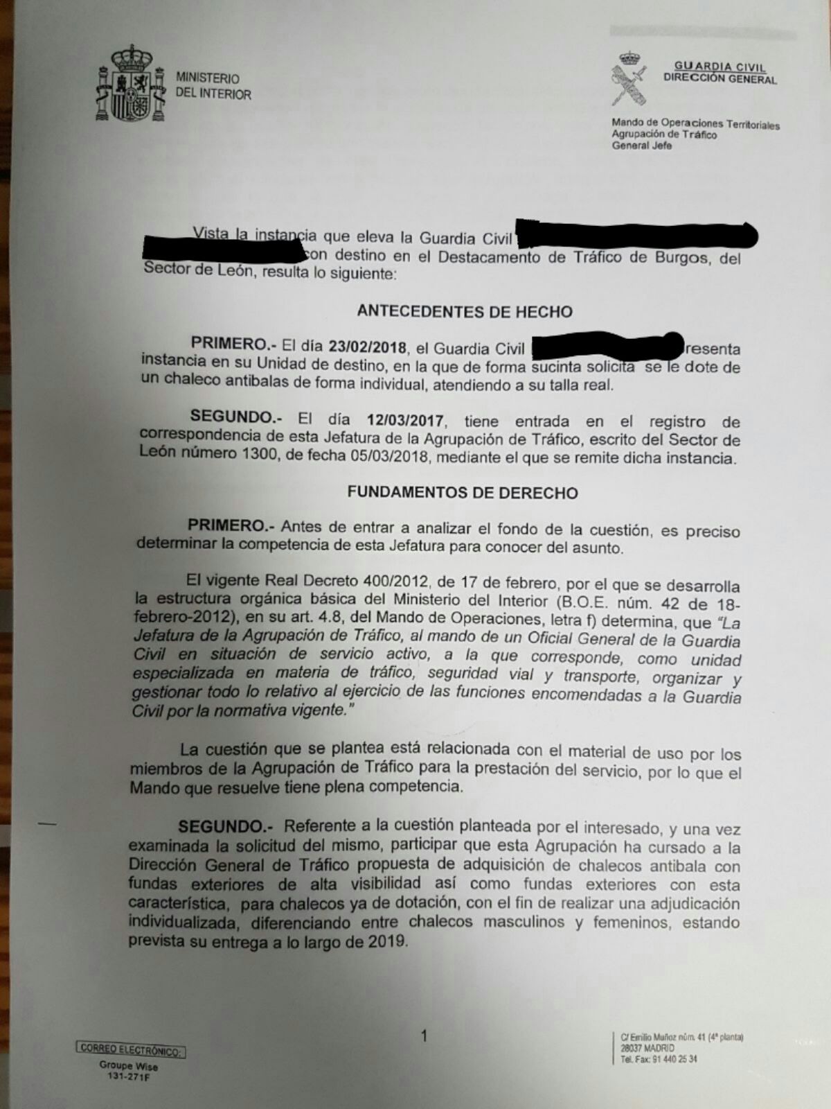 En su comunicado en respuesta a la instancia presentada por la guardia civil, la Jefatura de la Agrupación añade que “al tener conocimiento de que la Dirección General de la Guardia Civil ha recepcionado un número importante de chalecos antibalas de uso femenino se solicitó la cesión temporal de chalecos femeninos para entregar a cada componente de ese género que prestan servicio habitual en carretera, siempre que existiera disponibilidad de este último tipo de chaleco”.
