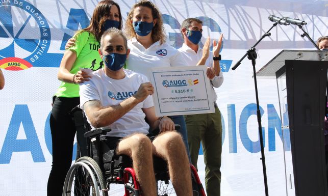 En el escenario ante el que ha finalizado la manifestación, y antes de la intervención del secretario general de AUGC, se ha vivido un momento de intensa emoción en el acto de entrega a Alejandro González de un cheque solidario obtenido gracias a las aportaciones de sus compañeros, recibidas a través de una campaña promovida por AUGC. Alejandro, guardia civil destinado en el Destacamento de tráfico en Santa Olalla de Cala (Huelva), sufría el pasado 21 de marzo un grave accidente con su moto particular tras una salida de vía. Fue trasladado de urgencia al Hospital de Zafra y posteriormente derivado al Hospital de Badajoz, donde fue intervenido de gravedad de las lesiones sufridas e ingresado en la UCI hasta el día 26 de abril. Dicho hospital emitió un informe donde aconsejaban e insistían en el traslado de Alejandro al Hospital de Parapléjicos de Toledo, por ser el de referencia nacional y especialista en la recuperación del paciente. Tras muchas dificultades administrativas, el trabajo y la presión de AUGC logró el ingreso de Alejandro en este centro de Toledo, donde hoy sigue recuperándose. Alejandro, visiblemente emocionado, ha recogido este cheque de manos de Eva María Gómez, secretaria general provincial de AUGC Madrid.