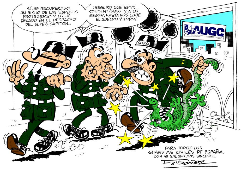 Ibáñez es uno de los dibujantes españoles vivos más importantes. La delegación de AUGC en Barcelona le entregó una placa en homenaje a su ingente trabajo. Y él, amablemente, nos hizo una viñeta en exclusiva para nuestra organización que reproducimos en documento adjunto y que seguro os hará sonreír. Próximamente publicaremos la entrevista que le realizamos.