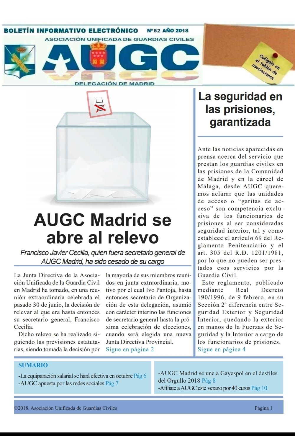 -Una nueva Junta Directiva Provincial para AUGC Madrid. -Carta de despedida por Francisco Cecilia, exsecretario general de AUGC Madrid. -AUGC aclara que la seguridad de las prisiones sí está garantizada. -Grande-Marlaska hará efectiva la equiparación salarial en octubre. -AUGC apuesta por las redes sociales. -AUGC Madrid se une a Gayespol en el desfile del Orgullo LGTBI 2018.